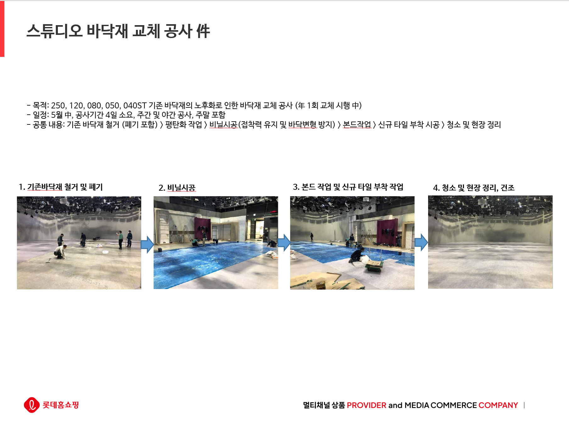 * 공사 기간 : 5월 內 (협의) 단, 24시간 방송을 하는 상업공간으로 아래 공사 기간에 공사가 진행 되어야 합니다.
